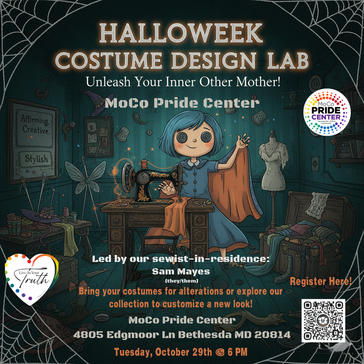 This Halloween event is led by our sewist-in-residence Sam-Mayes (they/them)! Bring your costumes for alterations, or explore our donated collection to customize a new look. Part of MoCo Pride Center’s Halloweek programming, hosted by Live In Your Truth!
