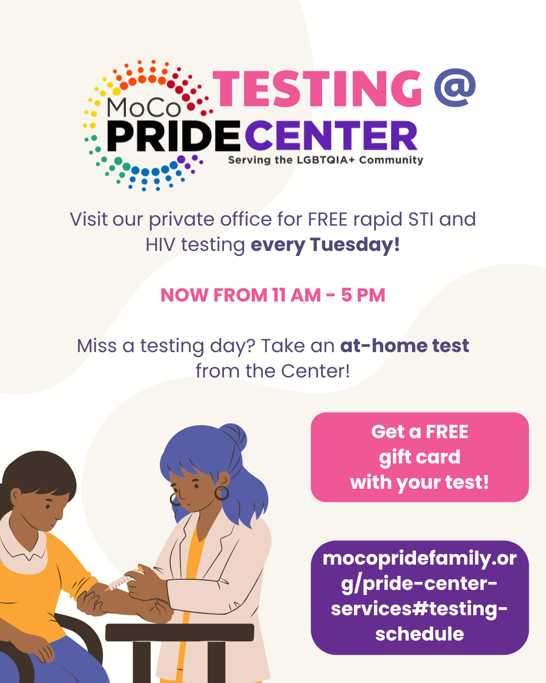 MoCo Pride Center offers free weekly STI/HIV testing in collaboration with our testing partners! Our official testing days are every Tuesday, the 2nd Thursday of the month, and the 4th Saturday of every month with occasional extra dates for special events. Anyone who gets tested will also receive a FREE GIFT CARD! Click the link below to keep up with our full schedule.