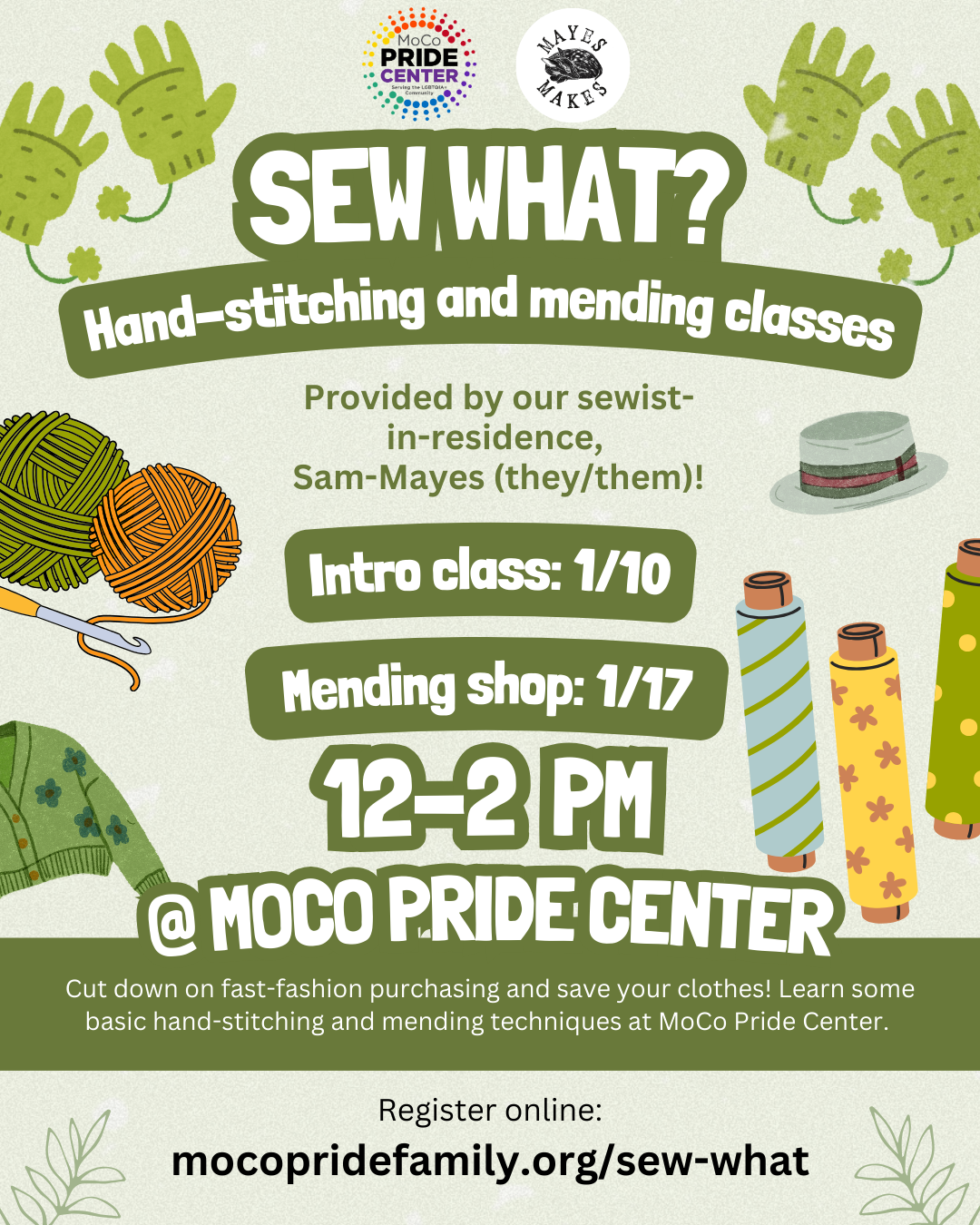 Sam-Mayes also offers personal alteration and mending help through MoCo Pride Center — feel free to speak to them one-on-one before or after class about personal projects or check out our exchange program.