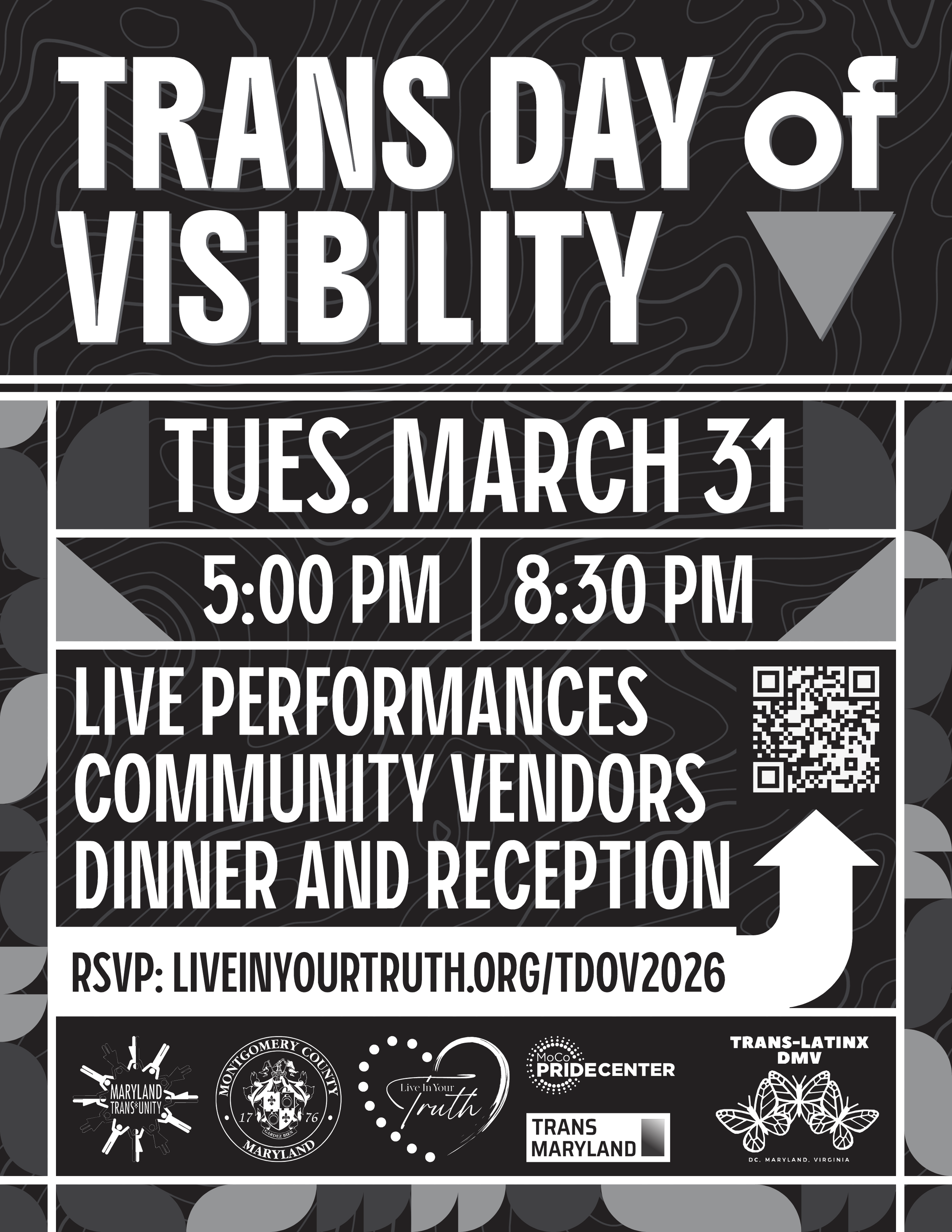 Bethesda, MD — On Tuesday, March 31, 2026, from 5:00 PM to 8:30 PM, Live In Your Truth, Trans Maryland, Maryland Trans Unity, and The Montgomery County Pride Family will host their second annual Trans Day of Visibility (TDOV) celebration at the MoCo Pride Center in Bethesda.